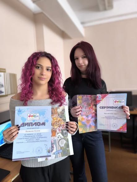 Вітаємо переможців! Михайленко Дар’я здобула І місце 🥇 у номінації «Комп’ютерна графіка» відкритого обласного конкурсу науково-технічної творчості «В гостях у роботів» 🤖🎨та взяла участь у у Міжнародному конкурсі «CreDiCo – 2025» Вдовенко Ксенія виборола ІІІ місце 🥉 у Міжнародному конкурсі з комп’ютерної графіки та вебдизайну «CreDiCo – 2025» 💻🌍 Щира подяка вчительці інформатики Благій Олені Юріївні 💙 за підготовку та підтримку учениць! Пишаємось вашими досягненнями та бажаємо нових перемог! 🚀👏